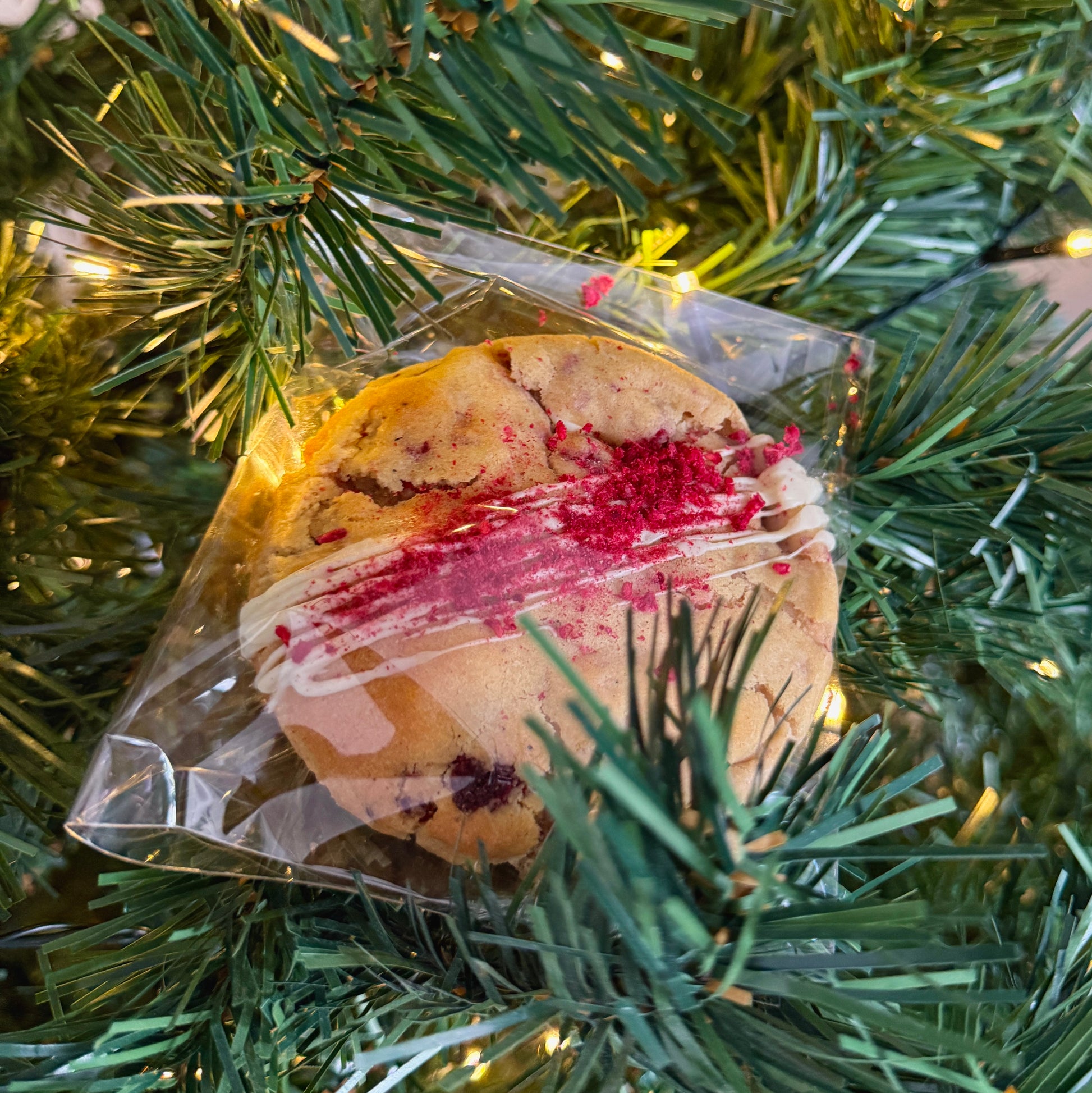 A fresh, fruity Christmas classic with a little sparkle. Original dough with white chocolate chips and freeze-dried raspberries baked through, filled with a jammy raspberry centre. Finished with a white chocolate drizzle and crushed raspberry. Sweet, bright and berry, berry festive.